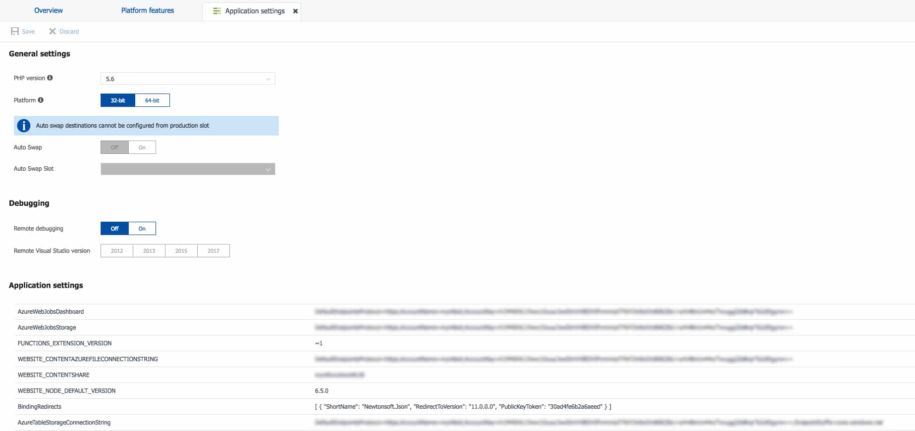 To run this live on Azure we need to add the app setting in the Azure Portal. Navigate to your Functions application and hit the Application settings button. Add an entry called BindingRedirects and add the same value that was added to the local settings file. However, do make sure that you do not escape the quotes in this one. Since this is not stored as JSON the backslash characters used to escape the string do more damage than they do good.