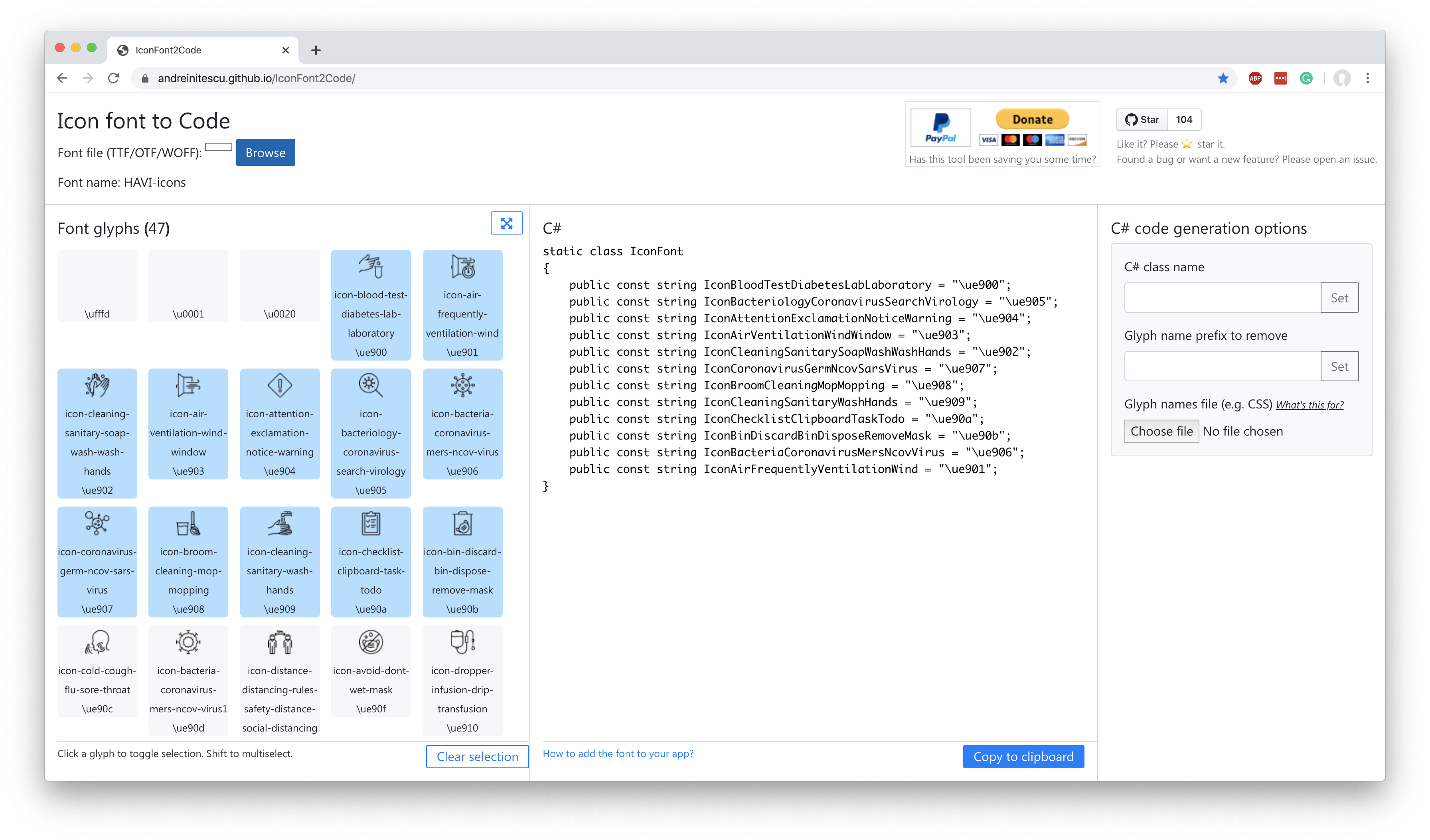 So now you have your font, but you want to use it in C#. Luckily, Andrei Nițescu has you covered! He has built this awesome tool to turn your icon font into a strongly typed C# class! All you have to do is upload the font file you just downloaded from IcoMoon and it should generate a simple class for you.