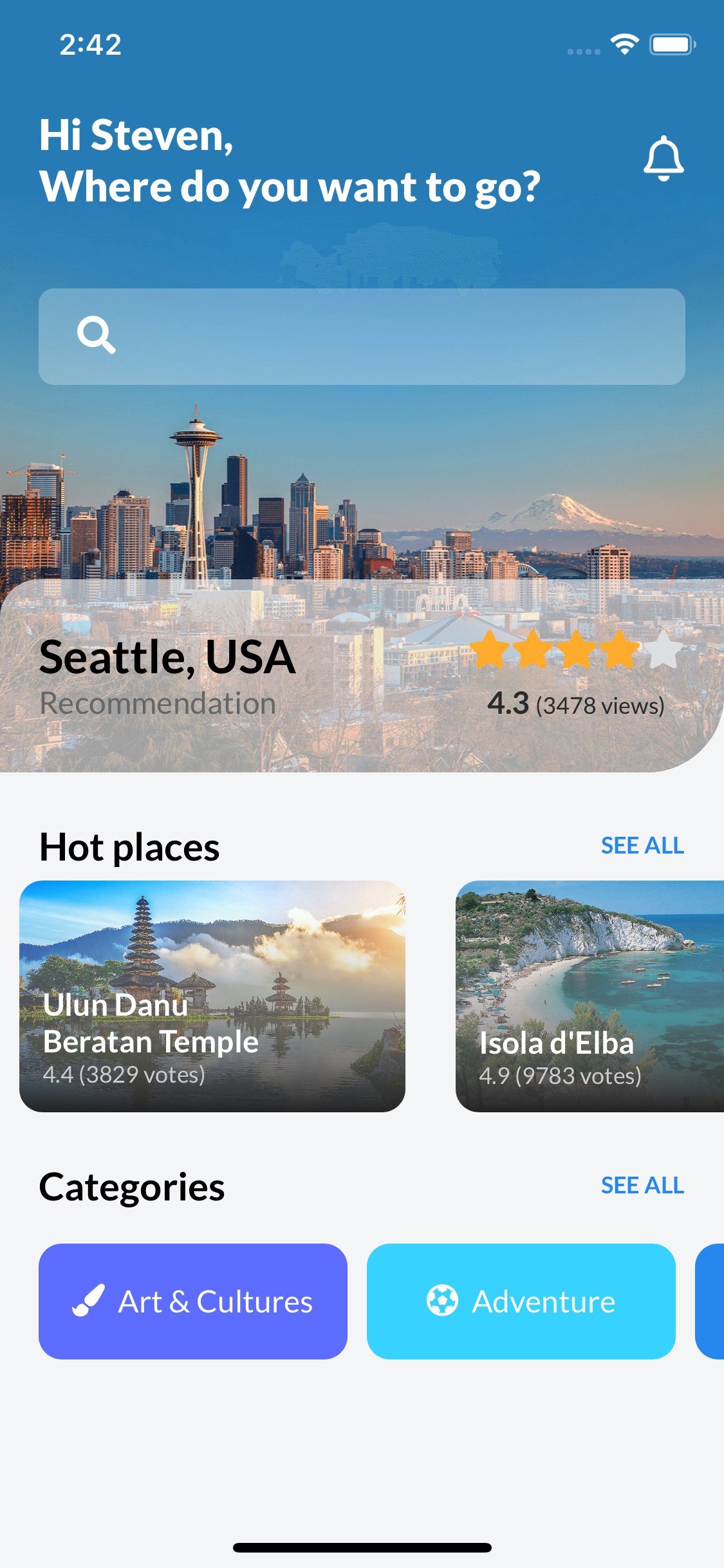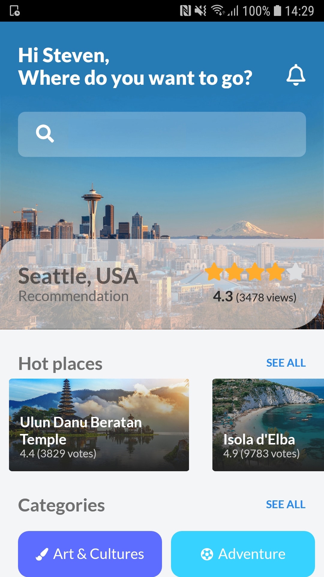 This app has two horizontally scrolling sections with content, one for the “Hot places” and one for “Categories”. This can easily be done by using a ScrollView and BindableLayout. However, if you’re willing to venture into the preview bits you will find the CollectionView which is also equally capable of pulling off this kind of layout.